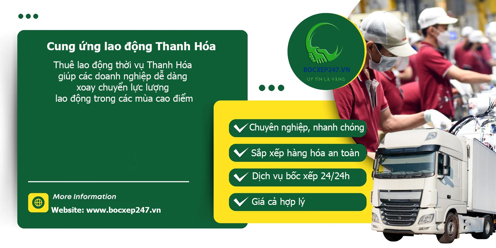 bocxephanghoa.vn tự hào là đơn vị uy tín chuyên cung ứng lao động Thanh Hóa với nhiều năm kinh nghiệm, đội ngũ lao động chất lượng, sẵn sàng đồng hành cùng doanh nghiệp phát triển bền vững.