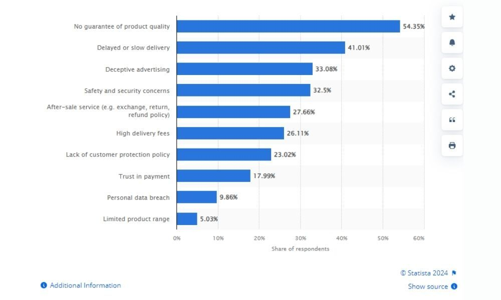 Theo một khảo sát mới nhất của Statista cho thấy người tiêu dùng Malaysia thường gặp phải những vấn đề khi mua sắm online. 54,35% cho rằng họ e ngại việc không có bảo hành cho chất lượng sản phẩm. Việc giao hàng chậm hoặc hoãn giao hàng là nguyên nhân thứ hai, chiếm 41,01%. 33,08% cho rằng quảng cáo lừa bịp, dối trá là mối e ngại thứ ba.