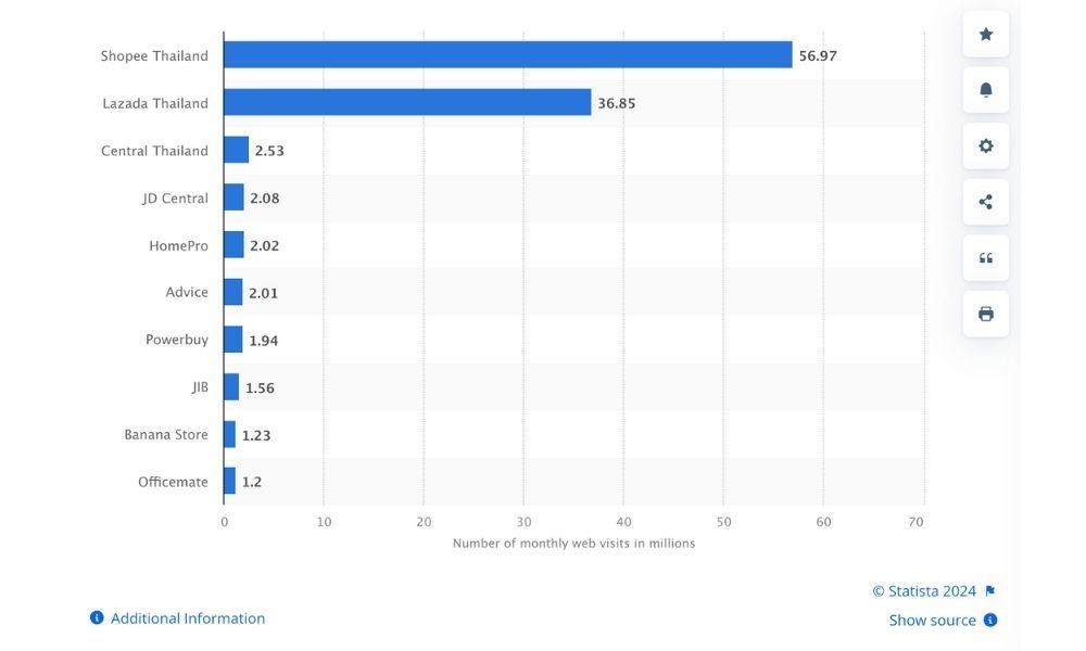 Shopee Thái Lan là trang web có đứng đầu tiên, có lượt truy cập hàng tháng cao nhất, khoảng 57 triệu. Tiếp theo là Lazada Thái Lan với khoảng 36,9 triệu lượt truy cập web hàng tháng.