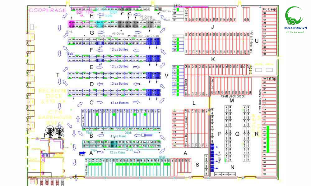 Bố cục sơ đồ kho hợp nhất hai khung kệ gần nhau, tạo hệ thống lưu trữ với nhiều lối đi. Nhà kho có ba lối đi chính và nhiều lối đi hành lang phụ, tạo không gian di chuyển hai hướng.